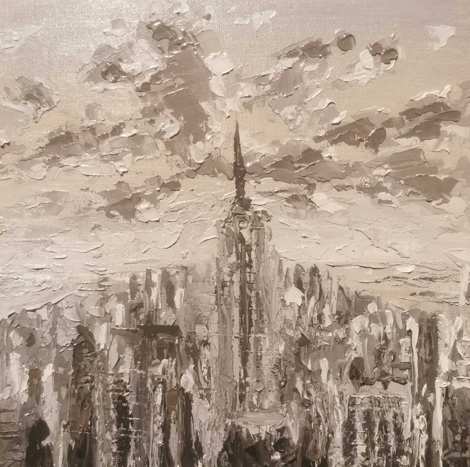 Eine zeitgenössische, ausdrucksstarke Interpretation einer Stadtlandschaft, eingefangen in einem Moment der Stille. Die monochrome Farbpalette und die strukturierte Oberfläche schaffen ein Gefühl von Tiefe, Ruhe und innerem Rhythmus - ein Gemälde, das Gleichgewicht und Stil in moderne Räume bringt.