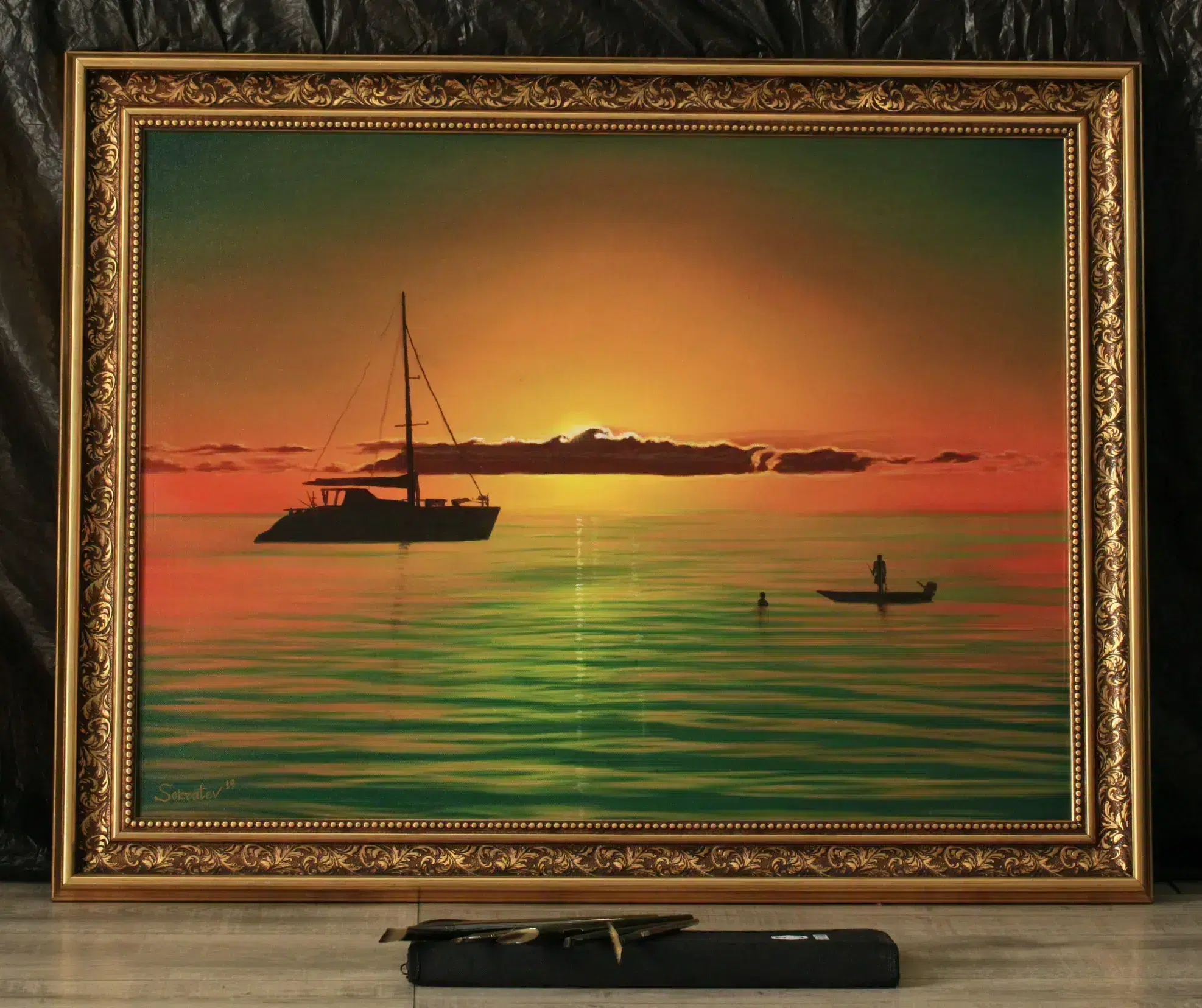 Das Kunstwerk wird mit dem auf den Fotos gezeigten Rahmen verkauft. Die auf den Bildern sichtbaren Pinsel sind nicht im Lieferumfang enthalten und dienen nur der visuellen Präsentation.